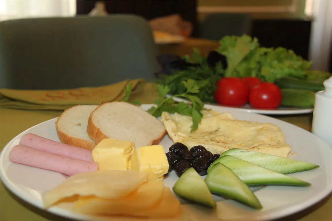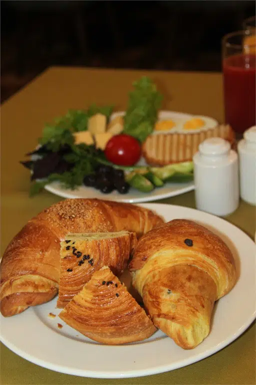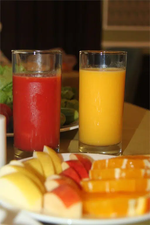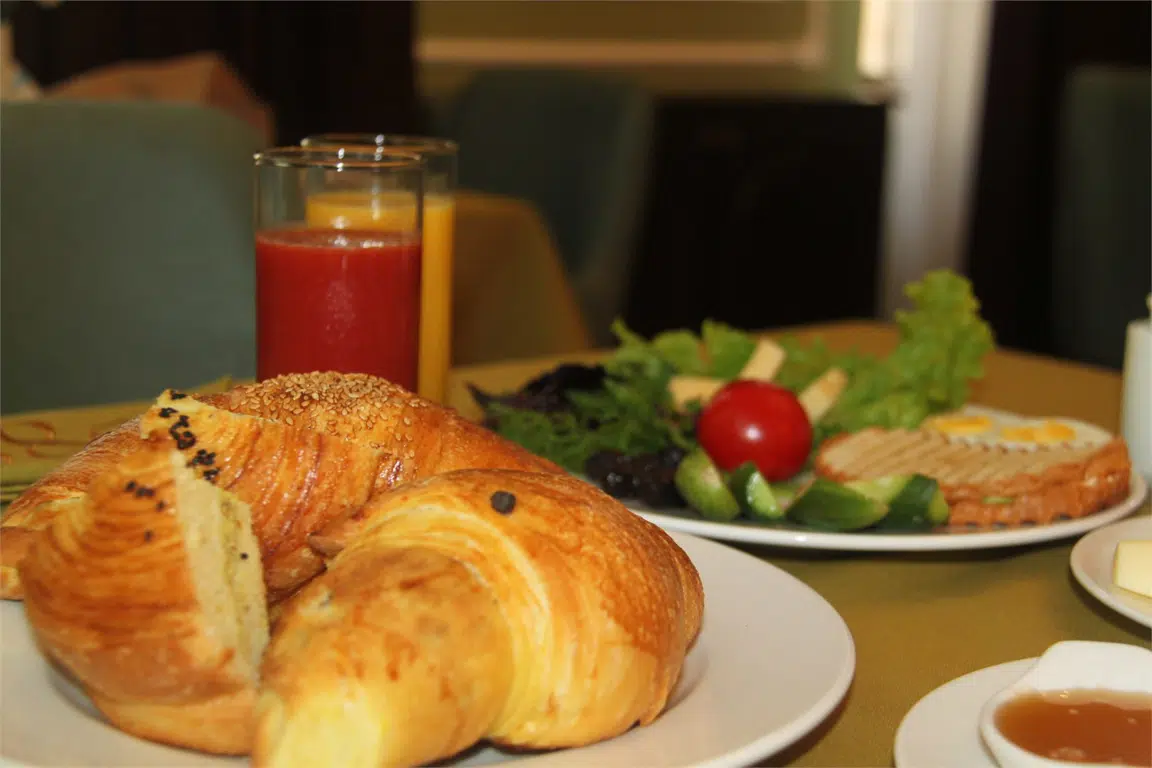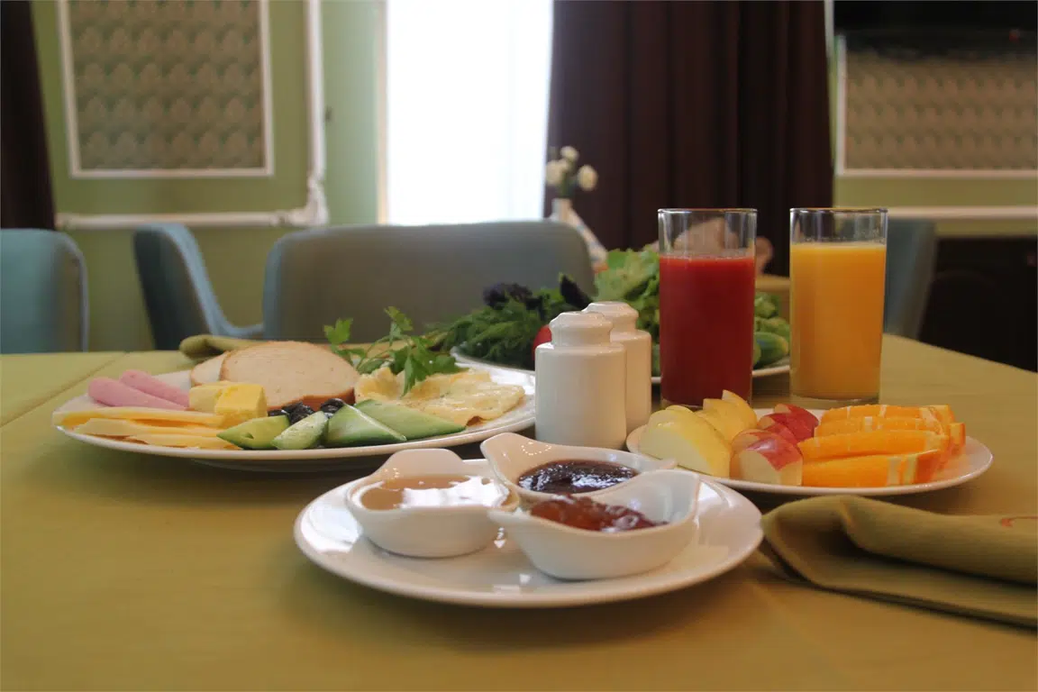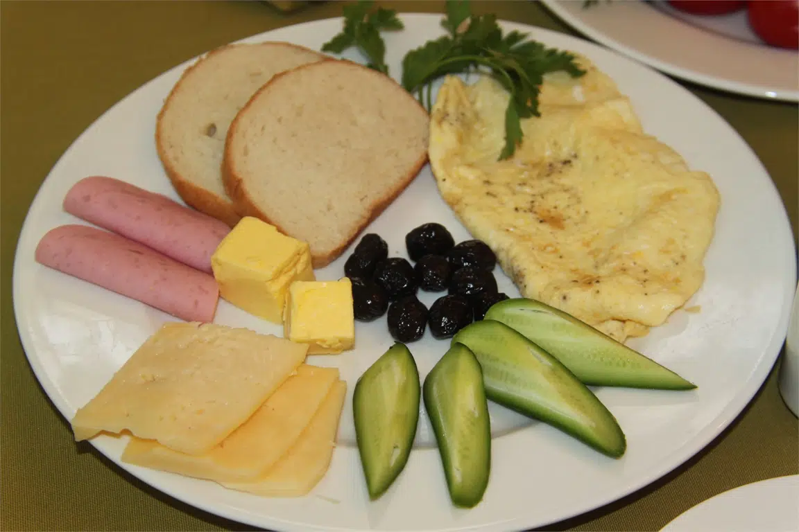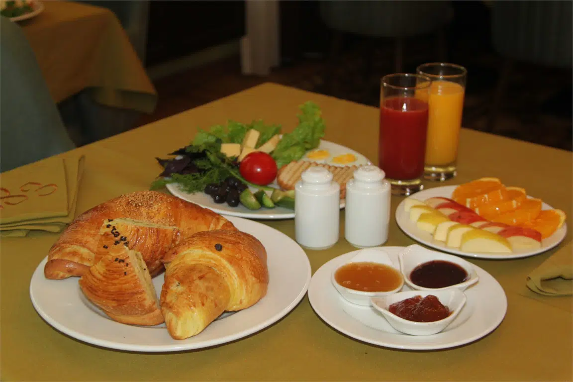 Continental breakfast and a small buffet sausage,scrambled eggs, cheese,butter,bread,fruits,vegetables,juice,coffee, tea.